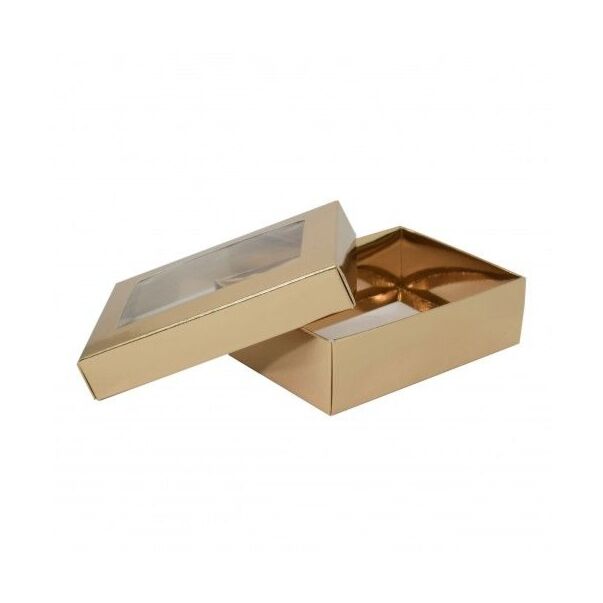 Ask i guldfärg med separat fönsterlock. Passar perfekt som presentask för gåvor eller för hemgjorda praliner eller andra läckerheter.