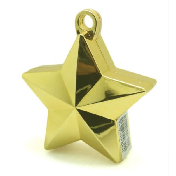 Stjärnformad gyllene ballongtygnd. Tyngden väger ca 135 gram. Tyngden fäster du med ett snöre i ballongen så att den heliumfyllda ballongen inte flyr.