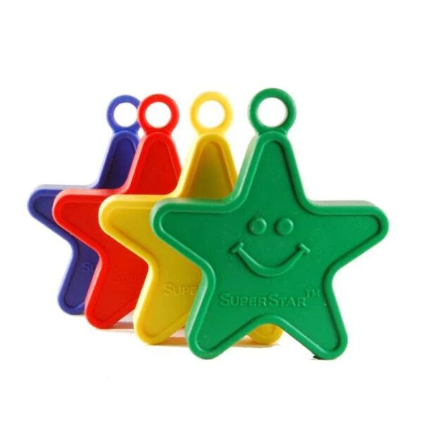 En stjärnformad ballongvikt i olika färger, innehåller 1 stycke.