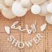 Vacker banner i gräddvitfärg med texten "Baby Shower" och moln dekorationer.