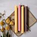 Kakorna är lätta att arbeta med i rumstemperatur, så det är enkelt att dela dem i halvor eller mindre bitar. Värm upp plattan med värmen från dina händer eller försiktigt med en hårtork, och du kan börja rulla plattan till ett ljus. Från en platta får du två ljus av kronljusstorlek.