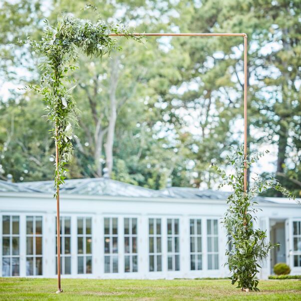 Bröllopsbåge i koppar. Du kan dekorera den med blommor, girlanger, tyg eller ballonger. Passar även som fotobakgrund för andra festligheter.