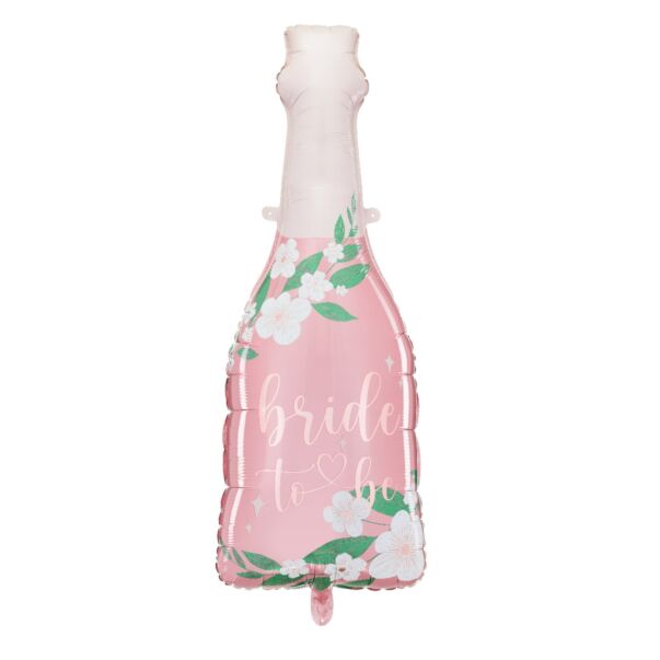 En fin rosa folieballong som liknar en champagneflaska, med texten "Bride to be". En fantastisk dekoration för möhippan!