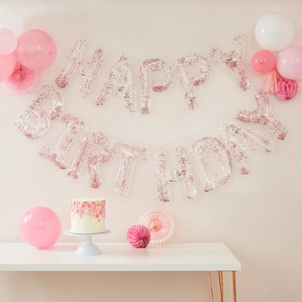 Transparent "Happy Birthday"-formad folieballong med roséfärgad konfetti.