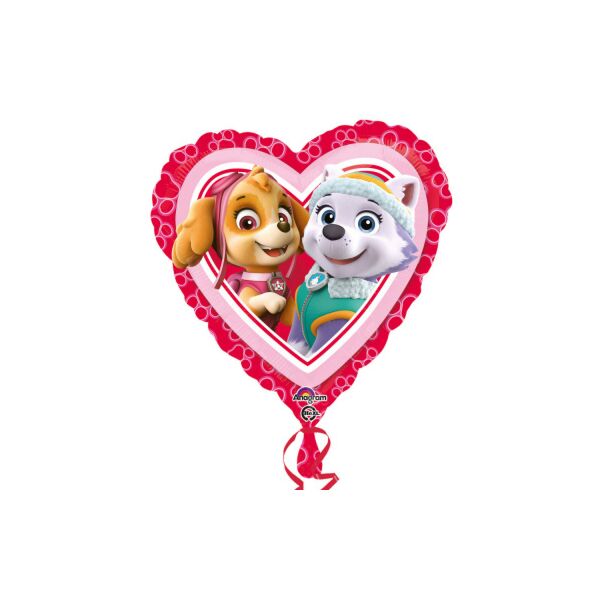 Hjärtformad Paw Patrol-folieballong med en bild på de populära karaktärerna Skye och Everest.