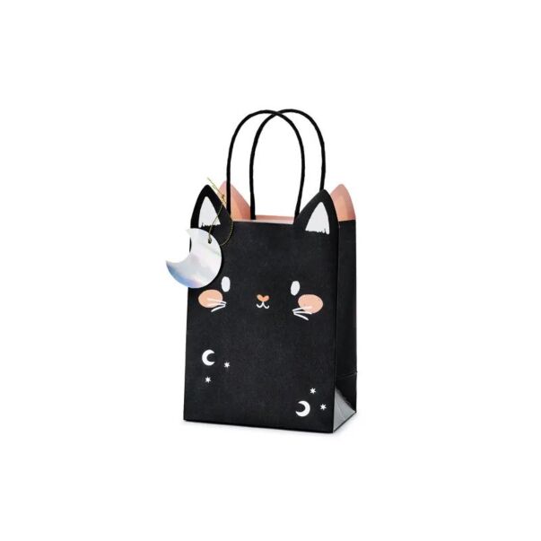 Gullig svart kattkartongpåse med holografiska detaljer. Hör till Halloween Hocus Pocus-temat, men passar också utmärkt för födelsedagskalas.