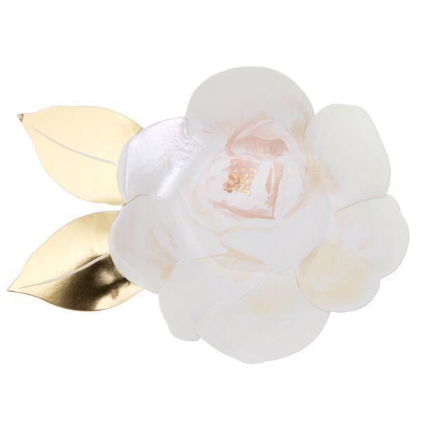 Gör din fest unik med dessa vackra papptallrikar. Vita engångstallrikar i formen av rosor med guldblad.
