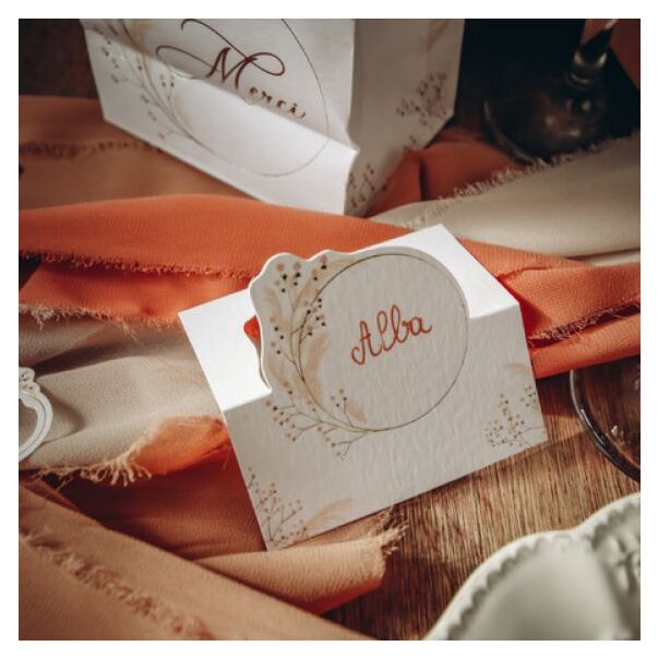 Vackra vikbara bordsplaceringskort med ett delikat ängväxttema på vit bakgrund samt gulddetaljer. Perfekt till Touch of Pampas-temat! Skriv gästens namn i cirkeln som står upp när kortet viks.