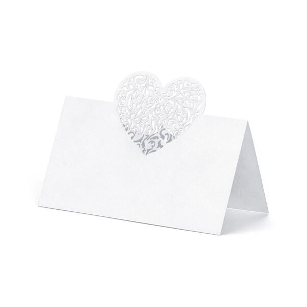 Fina vita placeringskort med ett laserskuret hjärta tillverkat av glimmande papper, 10-pack.