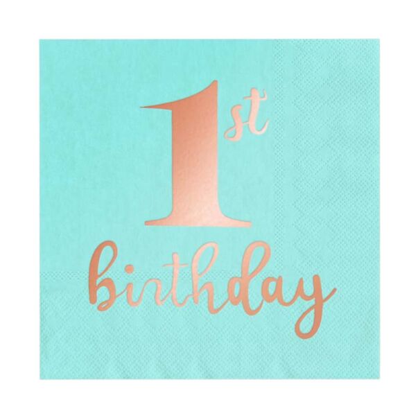 Ljusblå (nästan mint-färgade) servetter med texten "1st birthday" i guldfolie.