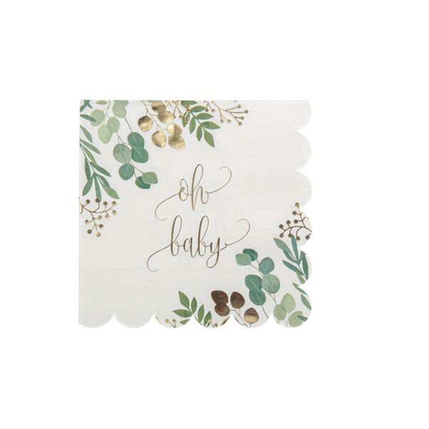 Vackra vita servetter med texten "Oh Baby", gröna blad och gulddetaljer.