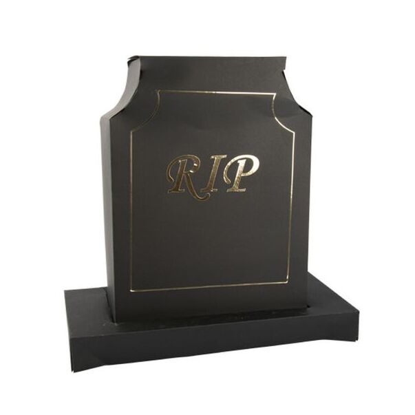 En stor svart gravsten av papp som är den perfekta Halloween-dekorationen!