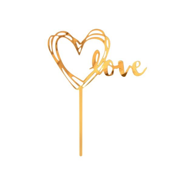 Guldfärgad cake topper av akryl med ett litet hjärta och texten "love". 13 x 10 cm.