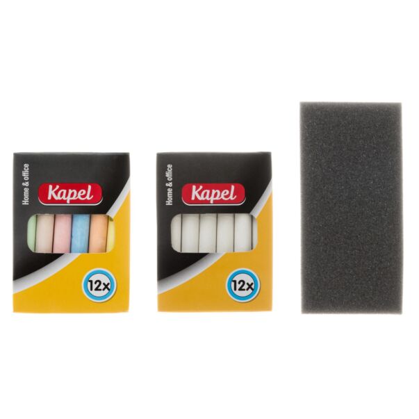 Tavelkritor- Färgade och vita + svamp, 24-pack.