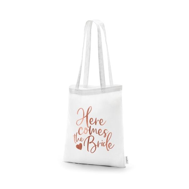 En härlig vit bomullsväska med texten "Here Comes the Bride" i roséguld.