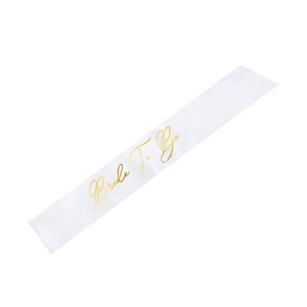 Vit sash med texten "Bride To Be" i guld. En användbar accessoar för möhippor! Klä sashen på den blivande brudens axel.